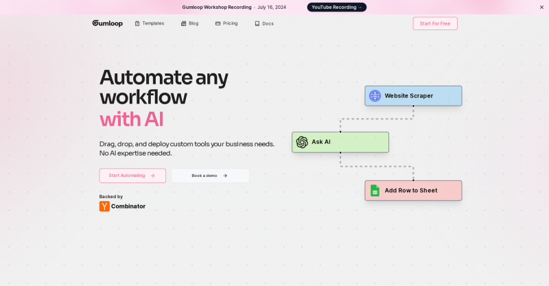 Gumloop is an AI automation platform enabling businesses to connect diverse AI models (GPT-4, Claude, Grok, etc.) to internal workflows. It operates with a drag-and-drop interface, allowing users to automate actions without writing code.