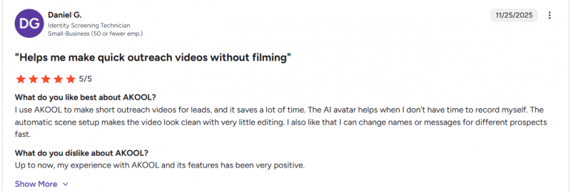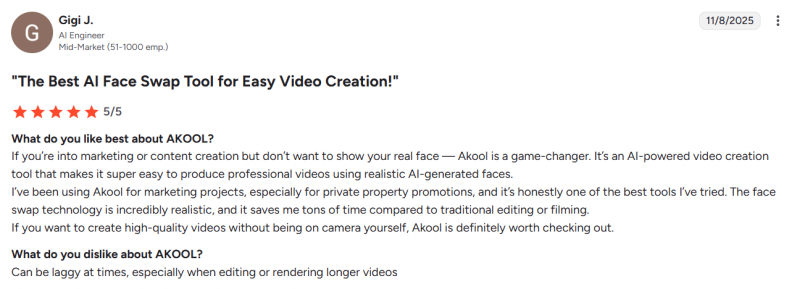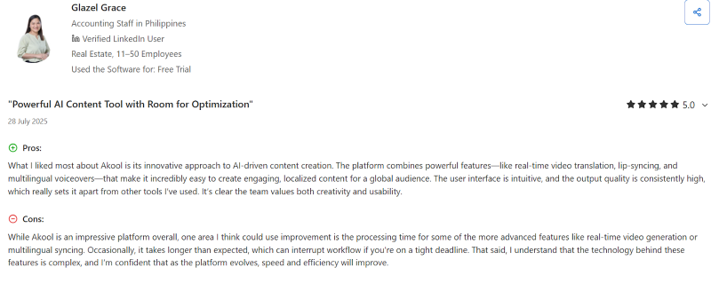 Taken together, the data paints Akool as a tool that genuinely changes how fast and how often teams can ship video, especially when they don’t want to be on camera or when they have to speak many languages. The strongest impression is that of a “creative accelerator”: it gets you from idea to highly presentable content with minimal friction, especially in marketing, education and social contexts, while still leaving room for a final human pass on language and polish.