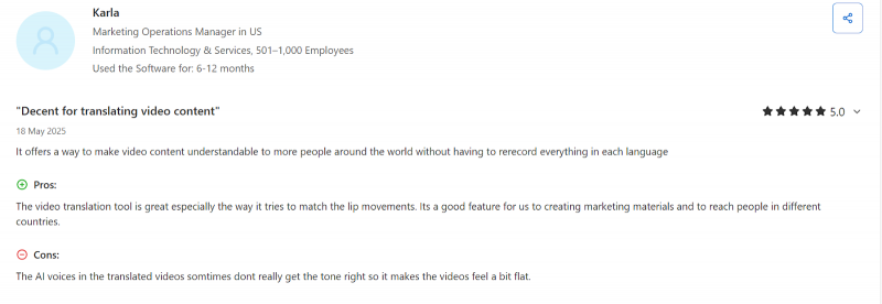 | Capterra | ≈4.5–4.7 / 5 | Dozens | Great for avatar/marketing videos; translation useful but not for official docs; occasional lag. |