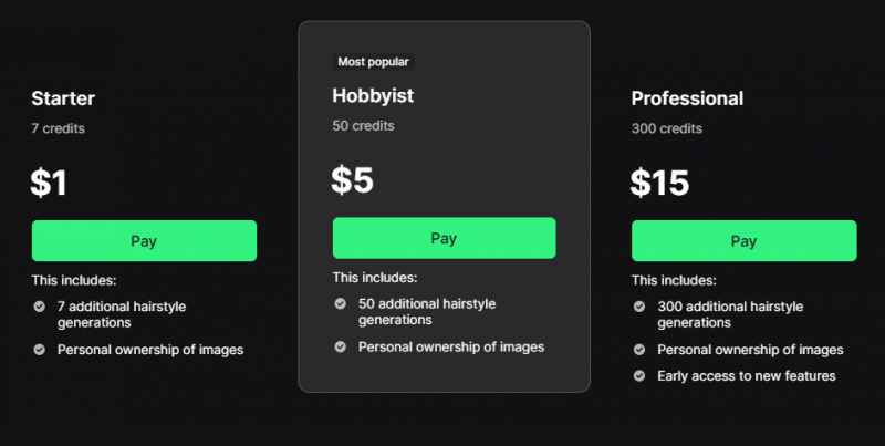 BarberGPT AI operates on a credit-based pricing system, which means you pay for individual hairstyle previews rather than committing to a subscription. The pricing plans are: