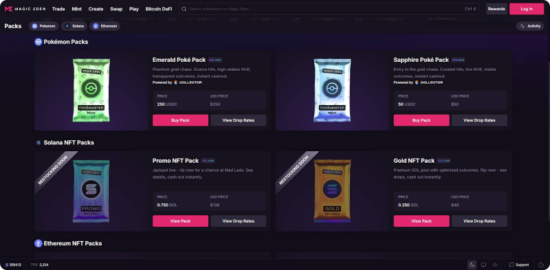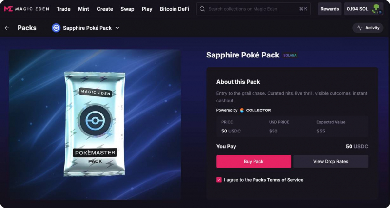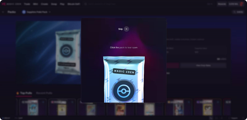 ● Browse available collections: Use Magic Eden’s marketplace filters to browse tokenized card collections or check out the Packs feature, where you can find Poké Packs.