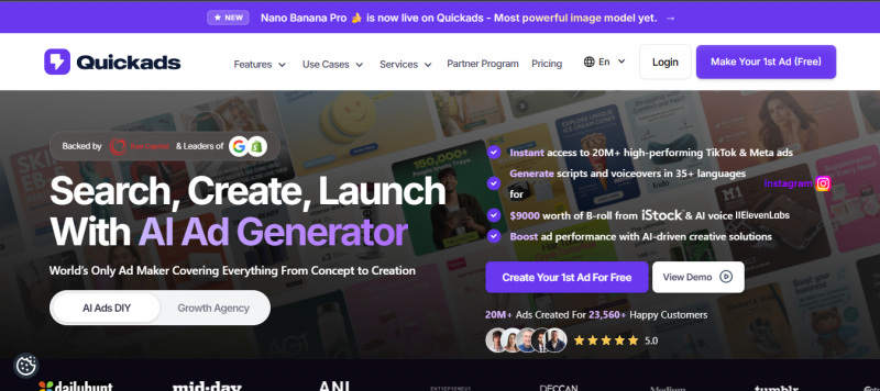 AdCreative.ai deserves its reputation. It launched in 2021, trained its models on more than 35 billion dollars in ad performance data, and today claims over 500,000 users creating banners, social creatives, and video ads with predicted conversion scores before launch. For a lot of marketers, it was the first “serious” AI ad platform that actually moved the needle.