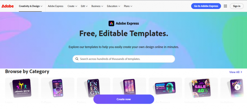 Adobe Express brings Adobe level design quality to a simpler interface with AI features built in. It is particularly attractive when you already pay for Adobe’s ecosystem.