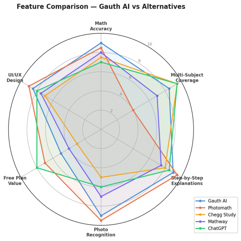 Figure 2: Radar chart comparing Gauth AI against four leading alternatives across six critical dimensions. Scores based on hands-on testing and aggregated user reviews.