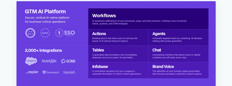Copy.ai is no longer just a template library for marketing prompts. The platform has pivoted hard into “workflows” and GTM automation. It can scrape CRM data, generate multi-step outbound sequences, build email and LinkedIn campaigns, and push assets directly into tools like HubSpot, Salesforce, Outreach, and Salesloft. The writing engine sits inside those workflows, not as a standalone feature.