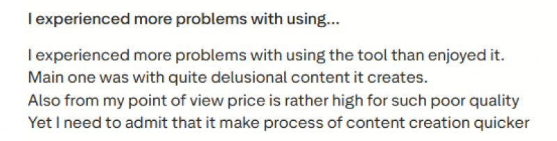 User feedback on Copy.ai is mixed, with some writers appreciating how much faster it makes content creation, while others feel the quality can be inconsistent. Many users say it is helpful for getting ideas down quickly and speeding up repetitive writing tasks, but some also mention that the output can feel overly generic or inaccurate at times. A few reviewers have also raised concerns about pricing, workflow issues, and lost work after updates, which can make the overall experience feel less reliable than expected.