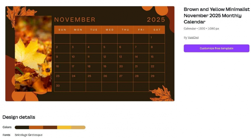Most no-code visual builders let you pick from pre-made color palettes that match well together. For example, here's a calendar template on Canva that features a palette of five colors, with brown and orange as the main shades.