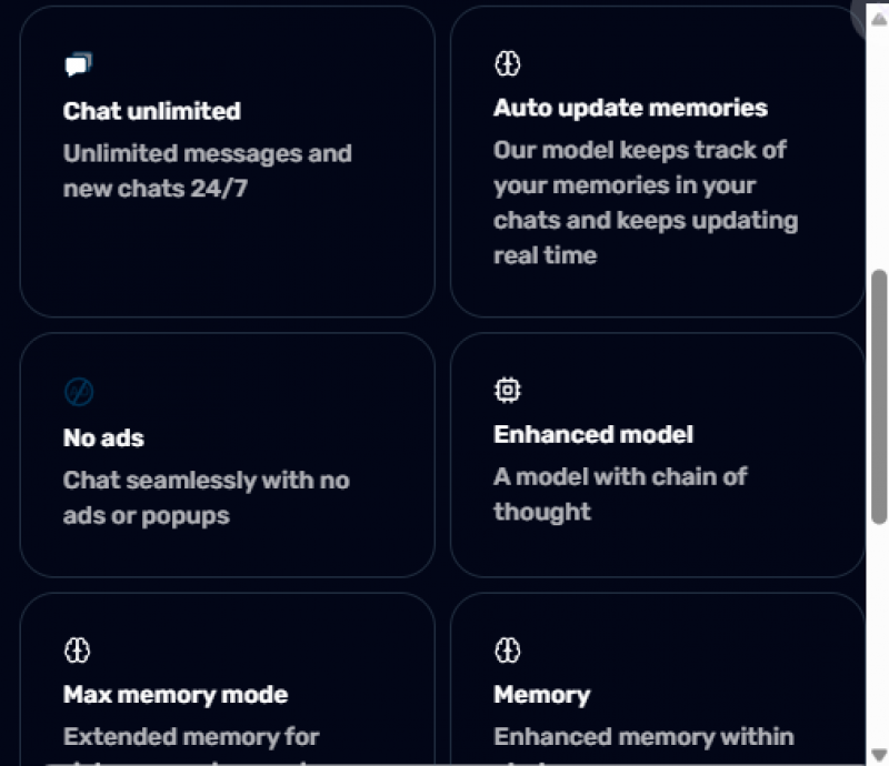 | Super Monthly | 12.99 per month | Effectively unlimited messaging, enhanced memory, voice calls, image sharing, visible thought process |