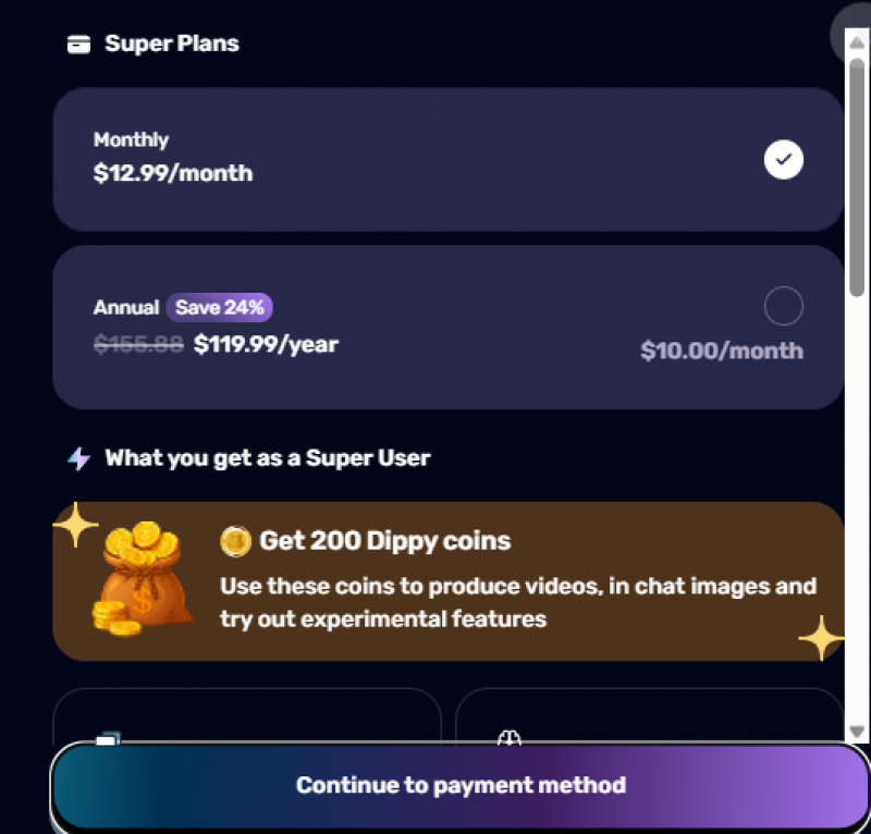 For most of its early life, Dippy offered truly unlimited free messaging. That changed when the platform introduced a 300-messages-per-12-hour cap on the free tier along with a more aggressive in-chat ad experience. The paid Super plan removes those caps and rolls in the higher-end features, including better memory and voice calls.