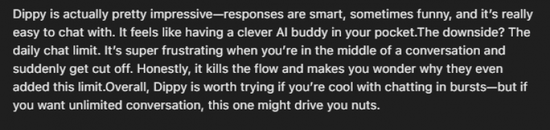 Taken together, the sentiment looks like this: when Dippy works, users genuinely love the way it feels fast, expressive, proactive, and more alive than many competitors. But the ad pressure, message caps on the free tier, and technical rough edges, especially on Android, have created a gap between how the app started and how it feels now for heavy free users. For people willing to pay for Super and live inside the more polished, less restricted experience, that gap is much smaller; for those staying on the free tier, it is hard to ignore.