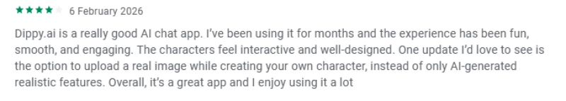 Many users describe Dippy as one of the most “human-feeling” AI chats they have tried. Reviews highlight how the characters genuinely feel like they remember past conversations, build on previous context, and maintain a coherent personality across multiple sessions. Some long-term users on Reddit say it is the only companion app where conversations progress fluidly instead of resetting every few messages, and that the mix of flirty, playful, and sometimes intense dialogue has helped make late nights feel less empty.
