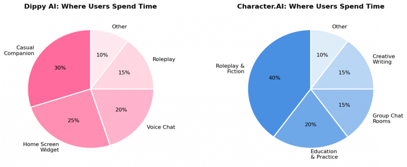 The behavioural split is telling. On Dippy, the home screen widget plus voice features pull users toward casual companionship quick check-ins, ambient chat, and emotional support roles. On Character.AI, the dominant activity is structured roleplay and fiction, often spanning hours and following long-running storylines, with education and group rooms taking secondary slots.