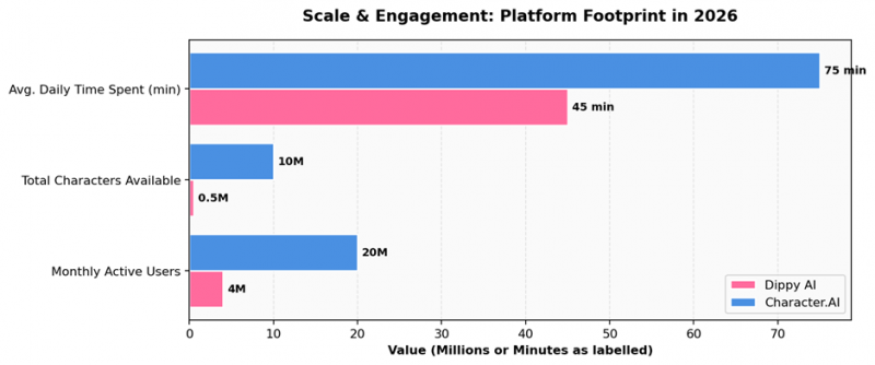 Character.AI's scale is roughly five times that of Dippy by monthly active users, and twenty times by character count. That scale advantage compounds in important ways — more users means more community-created characters, more niches covered, more refined personas, and more network effects. Dippy is growing fast but is still in catch-up mode on this dimension.