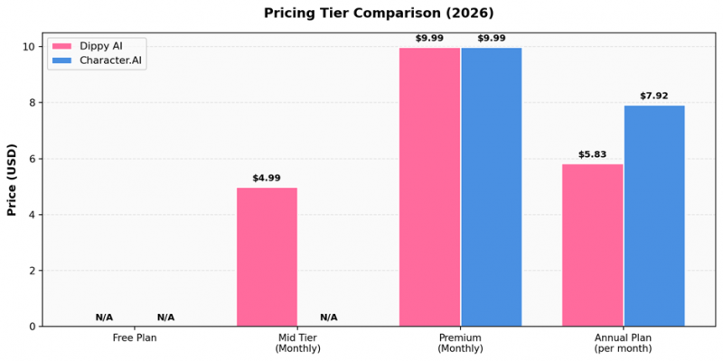 Both platforms cluster around the $9.99 monthly mark for their full premium tier, but Dippy offers a middle option (ad-free without Super features) that Character.AI does not. The annual plans on both bring effective monthly costs into the $5.83 to $7.92 range, which is competitive in the AI companion category.