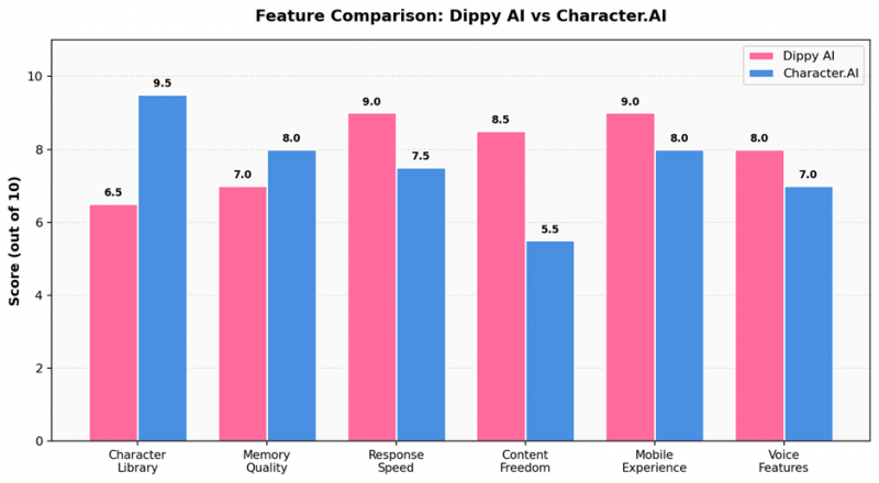 The pattern is clear. Character.AI dominates on raw scale — its character library is roughly twenty times larger, and its memory system has had more years to mature. Dippy AI takes the lead on response speed, content freedom, mobile experience, and voice features. These are not random wins; they reflect deliberate product choices each platform has made about what kind of experience to optimise for.