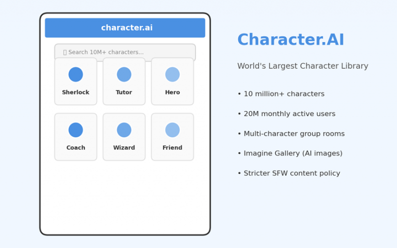 Choose Character.AI if: the goal is access to the largest character library on the internet, multi-character group rooms, language practice, creative writing collaboration, or interaction with celebrity, anime, and historical personas. The free tier is genuinely usable.