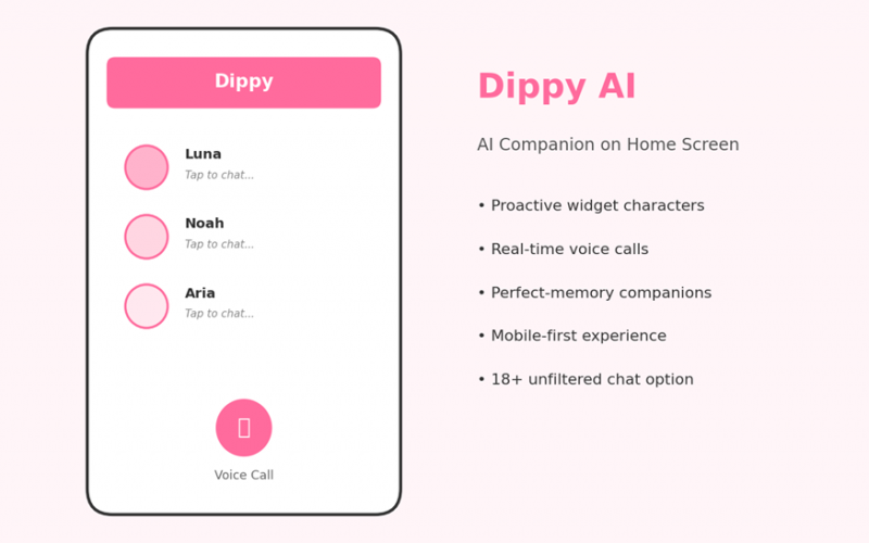 Dippy AI is a relatively new entrant, launched in 2024 by Impel Intelligence Inc. The pitch is simple but distinctive: instead of opening an app to talk to an AI, the AI lives on the home screen as a widget that proactively pops up with questions, observations, and check-ins throughout the day. That single design choice changes the whole emotional dynamic of the interaction.