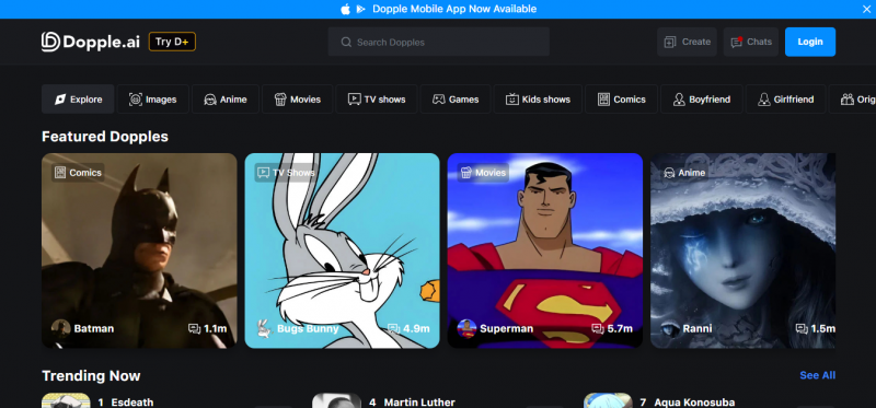 Character.AI has over 10 million user-created characters. Whatever you're into - a Shakespeare you can argue with, a study tutor for organic chemistry, a snarky detective from a noir story you're writing - somebody has already built it, often multiple versions of it. The search is solid, the discovery feed surfaces decent matches, and you can be deep in conversation within 30 seconds of opening the app. Dopple's catalog isn't bad, but it's a fraction of this.