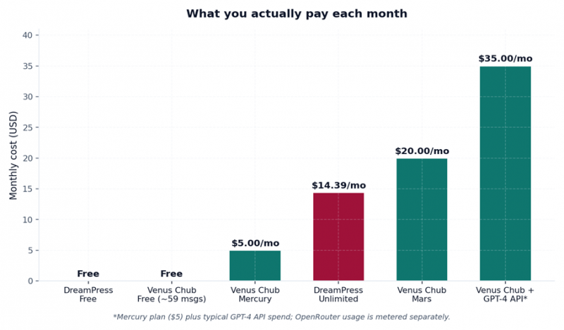 Figure 6. Real monthly spend across DreamPress AI and Venus Chub AI tiers - not headline pricing.