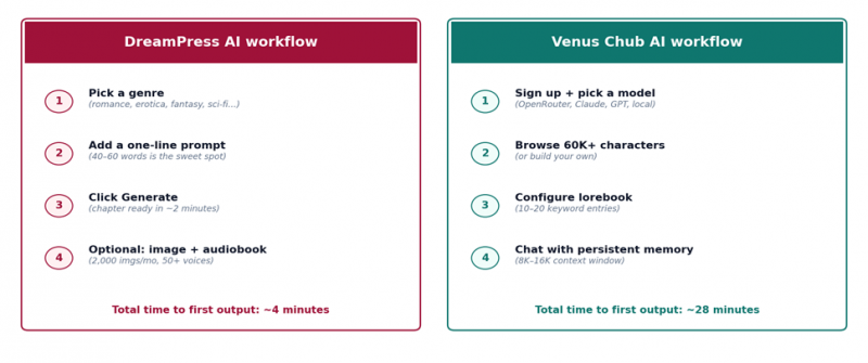 Setup friction is the single most predictive factor in which platform fits a given user. DreamPress AI prioritizes immediate output. Venus Chub AI prioritizes configurable depth. Below is the side-by-side workflow.