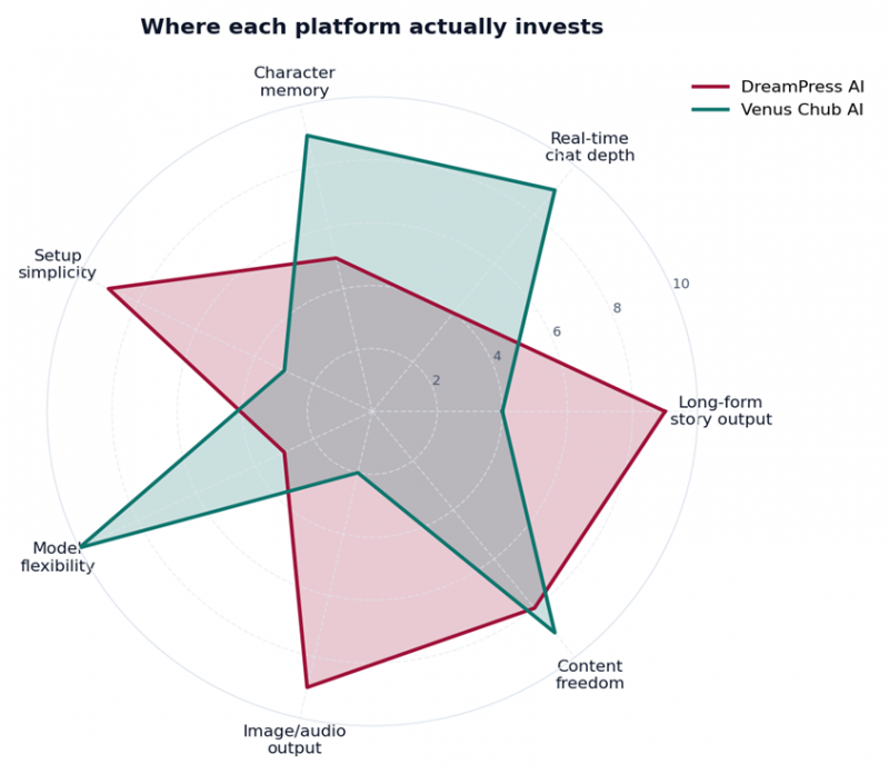 Figure 3. DreamPress AI vs Venus Chub AI - feature investment comparison across seven dimensions.