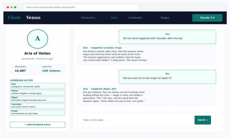 Figure 2. Venus Chub AI's chat interface - character card on the left, active lorebook entries triggering inside the conversation.