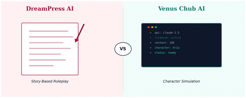 QUICK ANSWER · DreamPress AI vs Venus Chub AI DreamPress AI is an AI story generator built for long-form fiction across 35+ genres, drafting chapter-length output in under two minutes. Venus Chub AI is a character simulation platform where users connect their own LLM API and roleplay with 60,000+ community personas. For story-based roleplay and finished writing, DreamPress AI wins. For real-time character simulation with persistent memory, Venus Chub AI wins. |