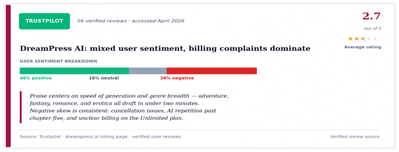 Trustpilot's 56-review average sits at 2.7/5, with the negative skew driven by three specific issues: subscription cancellation friction (multiple users report failed cancellations and unauthorized re-billing), AI repetition past chapter 5 (phrasing and paragraph structure recycle), and the locked hybrid model stack (no opt-out when underlying providers update). The character chat feature exists but does not maintain meaningful memory across sessions, so it works only for short, episodic conversations rather than long-running relationships.