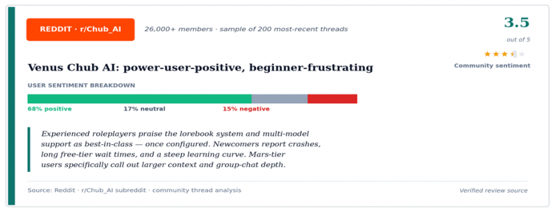 The platform pulls 7.3 to 13.9 million monthly visits as of early 2026, though one third-party analysis flagged a recent ~65% traffic decline and ongoing payment friction (cryptocurrency works reliably; card processing is intermittent). Reddit sentiment on r/Chub_AI runs 65–70% positive, but skews heavily toward power users - newcomers report crashes after platform updates, long free-tier wait times, and a steep learning curve.
