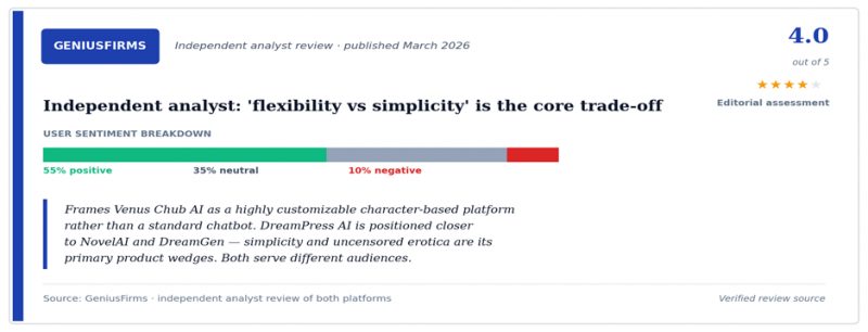 | Audit which model actually generated each reply | Venus Chub AI | Model identity is visible per chat; DreamPress AI's hybrid stack is opaque. |