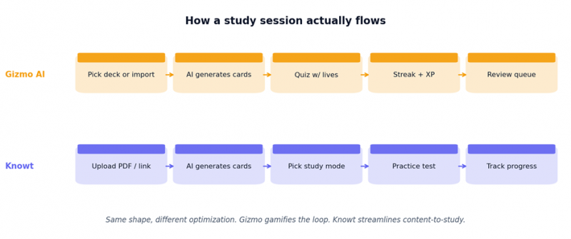 Gizmo gamifies the loop every step earns XP, builds a streak, or risks a life. Knowt streamlines content-to-study upload a file, get cards, pick a study mode. Whether you want studying to feel like a game or like a frictionless tool is the best predictor of which app you'll prefer.