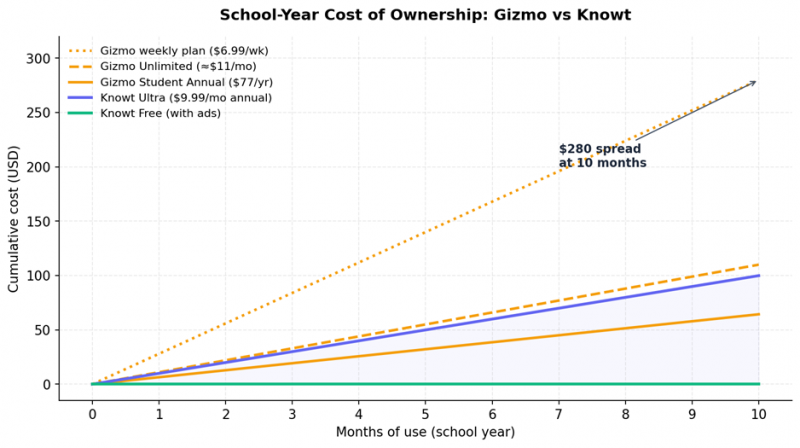 • Cost gap: $280 spread between Knowt Free and Gizmo's weekly plan over 10 months — roughly the price of a graphing calculator.