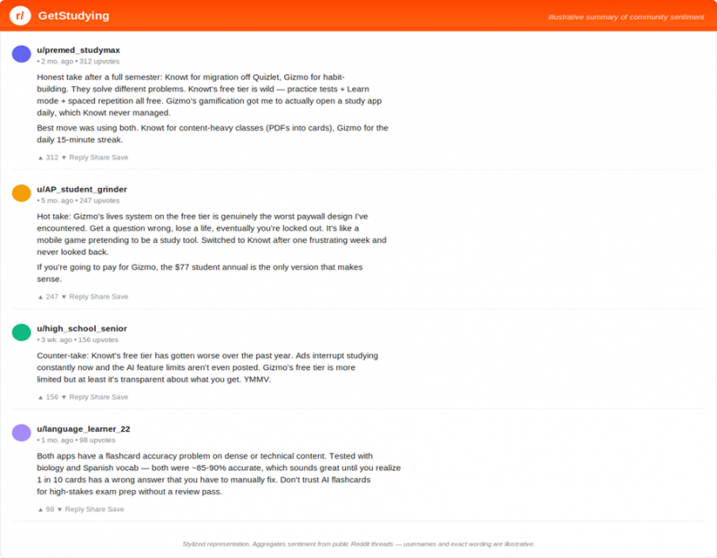 Reddit threads on r/GetStudying, r/ApStudents, and r/college are where the real practitioner conversation lives. The pattern: serious students who care about price gravitate to Knowt, students who struggle with study habits gravitate to Gizmo. A meaningful share maybe 30% end up using both.