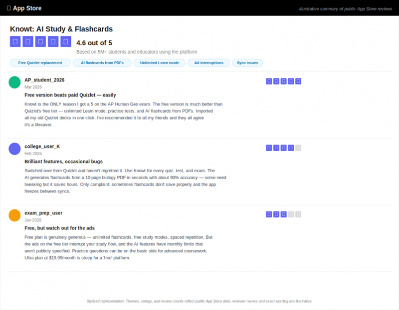 Rating: 4.6 / 5 across 5M+ users. Praise centers on the genuinely generous free tier- unlimited flashcards, free Learn mode, AI generation from PDFs at ~90% accuracy. Complaints focus on three things: ad interruptions on the free tier, occasional sync bugs (cards not saving), and the Ultra plan price ($19.99/month) that some users consider steep for a platform marketed as free.