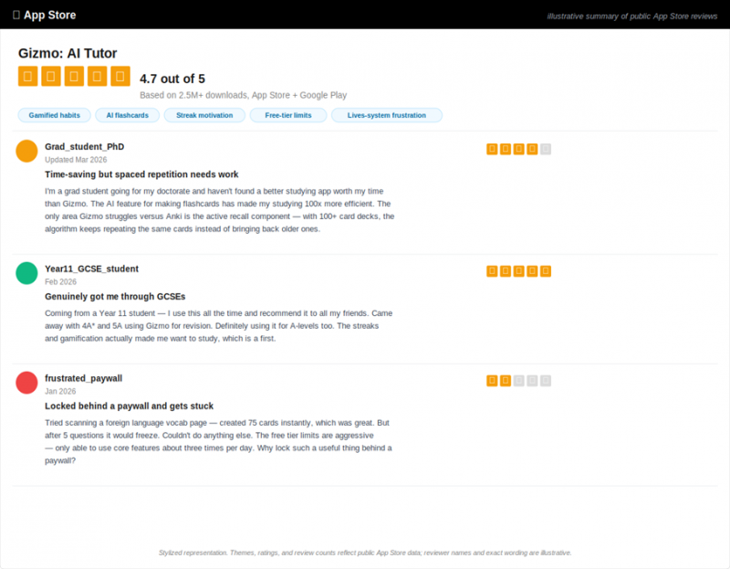 Rating: 4.7 / 5 across 2.5M+ downloads on the App Store and Google Play. The praise is consistent: AI-generated flashcards save hours, gamification motivates daily study, the mobile UX is polished. The complaints cluster around aggressive free-tier limits the "lives" system that locks you out after wrong answers and a spaced-repetition algorithm that some power users find skews to recent cards over older ones.