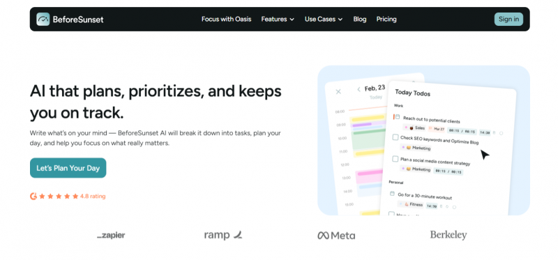 BeforeSunset AI combines a daily planner with a focus “oasis” that keeps you in a distraction‑free environment while you work. It’s a good fit if you care as much about staying in flow as you do about fitting everything into your schedule.