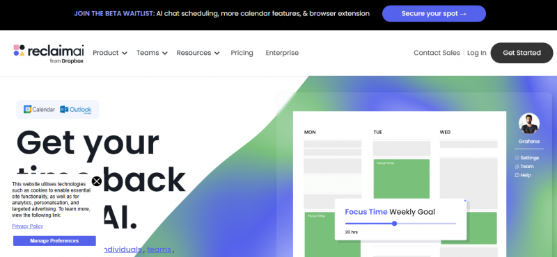 Features: Focus time optimization, smart meeting moves, team analytics, and robust Google Calendar integration.