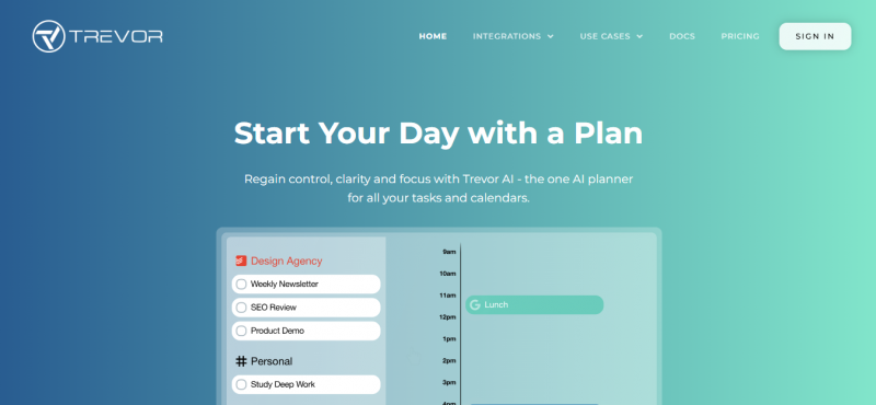 Trevor AI focuses on calm, visual daily planning rather than heavy automation, making it ideal for solo users who want structure without overwhelm. You drag tasks onto your calendar while the AI nudges you toward realistic time blocks and reschedules when needed.