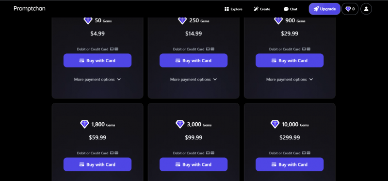 Promptchan uses a virtual currency called Gems. One Gem typically generates one basic image. The free plan gives you 10 Gems per day (enough for a handful of standard generations), while paid plans bundle anywhere from 300 to 1,500 Gems per month.