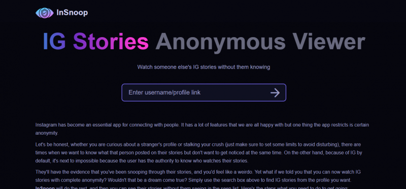 InSnoop is a free, browser-based tool designed for viewing public Instagram stories and highlights anonymously. It operates entirely online through a web interface, meaning there is nothing to install, no app to download, and no account to create. You visit the site, type in a public Instagram username or paste a profile URL, and the tool fetches the available content on your behalf.