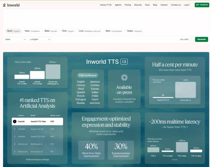 | Inworld TTS-1.5 Max | Per 1M characters | $10.00 ≈ $0.01/min | Higher-quality voice option. |