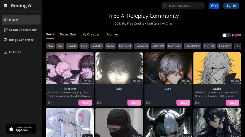 Gening AI is a browser-based generative AI platform designed primarily for interactive character chats, roleplay, creative storytelling, and simple content generation. Unlike traditional single-purpose chatbots, Gening AI blends conversational AI with creative media tools such as basic image and voice generation to create more immersive AI experiences.