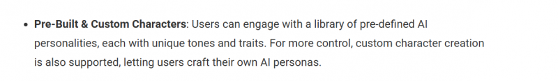 ● Character Creation & Customization: Character library with many pre‑made personas that users can select and chat with immediately. Limited but present customization of tone and style (e.g., more serious, more playful), though deep configuration is described as still minimal.