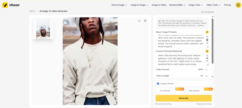 Under normal conditions, Vheer is actually quick. Most image generations landed in the 5 to 10 second range during testing. Even during heavier periods, wait times rarely became frustrating.