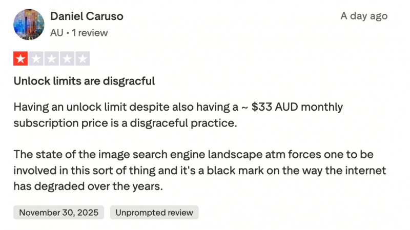 Many users complain about unlock limits, pricing, and credit consumption rules. A frequent frustration is that unlocking one result uses multiple credits when the same image appears across several websites. Users feel they are paying repeatedly for the same information.