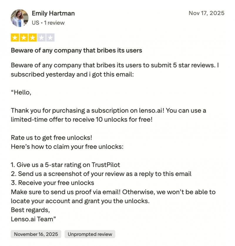 This is where things get serious. One user publicly shared that Lenso AI emailed them offering free unlocks in exchange for a 5 star rating. The message included instructions for rating the tool and sending a screenshot of the review to receive the reward.