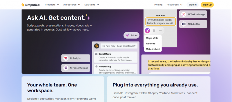 Simplified combines AI images, AI copywriting, design, and social posting in a single dashboard. It suits people who write posts, design them, and publish them, often alone or in a very small team.