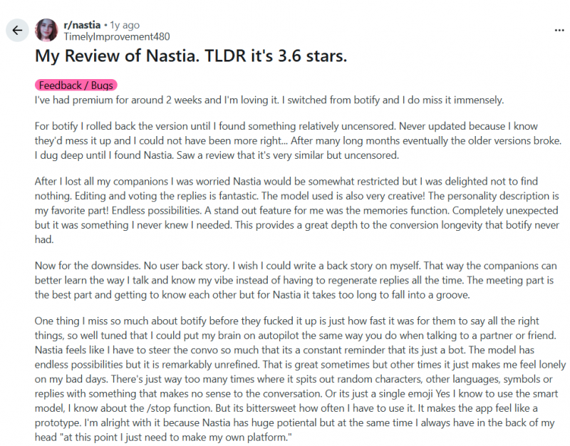 Nastia AI is designed to remember user preferences. You can create characters with custom backstories, personalities, and traits, and the AI will recall them over time. Reddit users report that this feature makes long-term chats more engaging, although memory glitches sometimes break immersion.