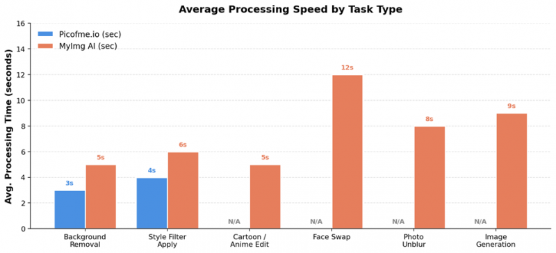 The takeaway: Picofme.io is faster on the narrow set of things it actually does, partly because the operations are simpler-background removal and a colour overlay just don't require as much compute as a full face-swap render. MyImg AI is consistently in the 5–12 second range across far more complex tasks, which is genuinely fast for what it's doing. Neither tool will leave you twiddling your thumbs.