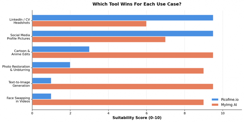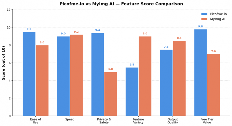 A few things jump out of this chart immediately. Picofme.io leads on ease of use, privacy, and free-tier value-exactly the things a casual user notices in the first 60 seconds. MyImg AI pulls ahead on feature variety and output quality, which matters more once you've outgrown a single use case and want to do creative work.